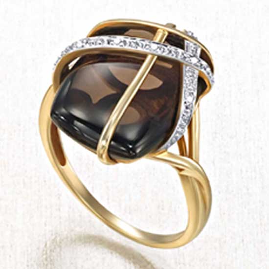 Pictured is a yellow gold pendant with artistic details. The dazzling diamond accents offer added elegance. The smoky quartz offers alluring beauty.