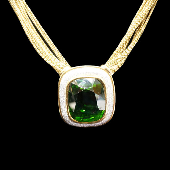 This necklace is indescribably gorgeous with its 284-carat Burmese peridot pendant. The strands of yellow gold greatly enhance the necklace’s luxurious flair. This gorgeous piece is truly one-of-a-kind.