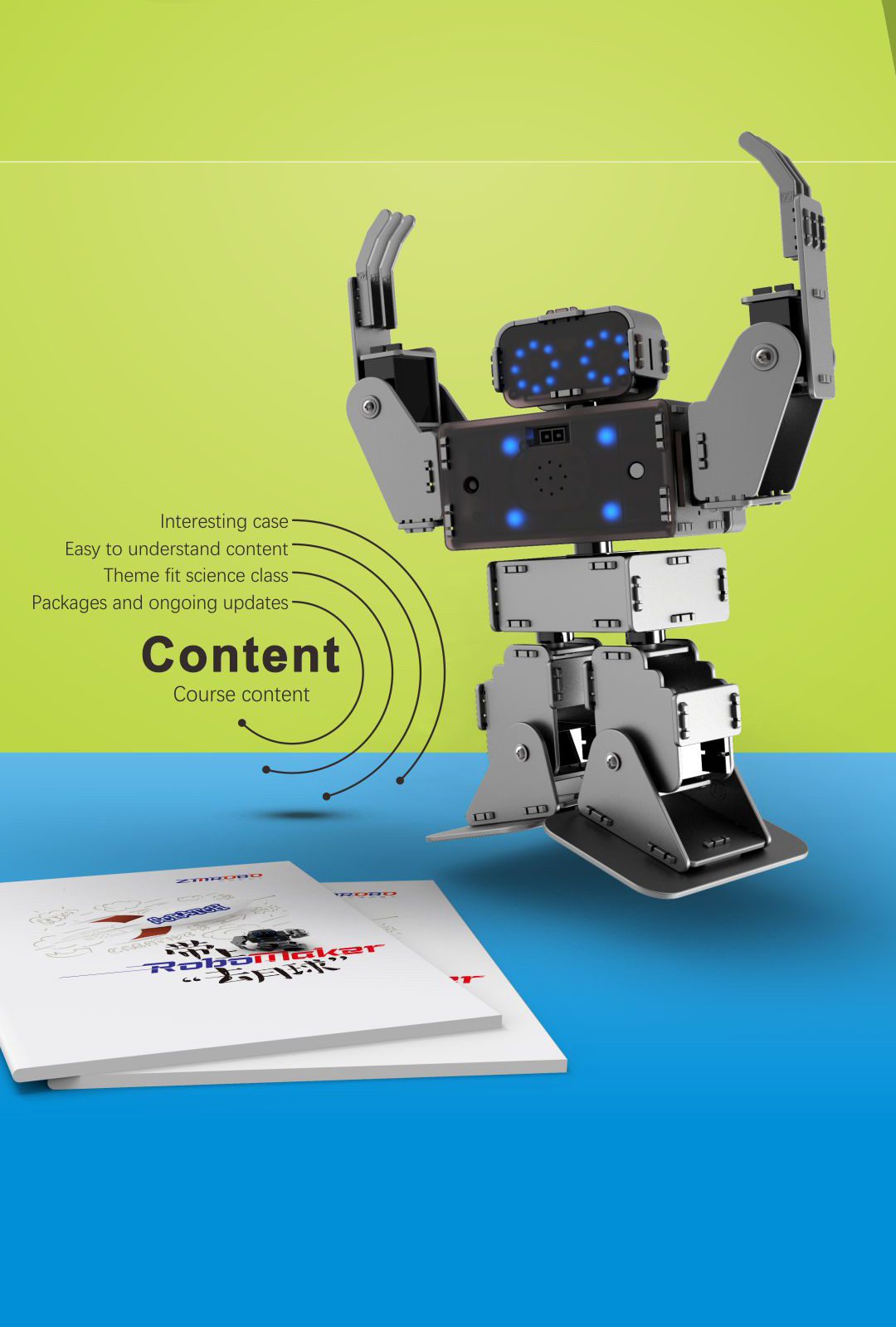 ZMROBO RoboRun set is equipped with eight programmable electronic modules (five signal receptions andt hree status outputs), and the work of the programmable control module is gradually learned through two stages, 26 lessons(40-50 minutes/course) in total.The course also includes the introduction of patrolling, extension design,software and hardware interaction and other content,rich knowledge points,wide coverage of the content, and is an excellent teaching tool for robot programming education introduction learning.
