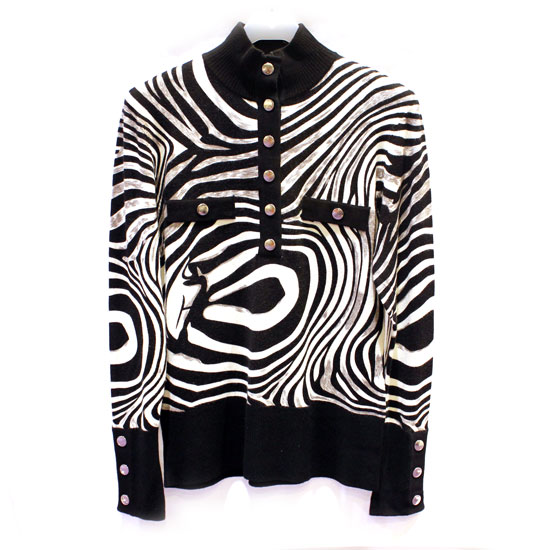 Make a bold fashion statement with this alluring rayon blouse. This ladies’ blouse boasts an allover zebra print conveying a stylish touch. Metallic buttons embellish the placket, breast pockets, and cuffs for consistency.