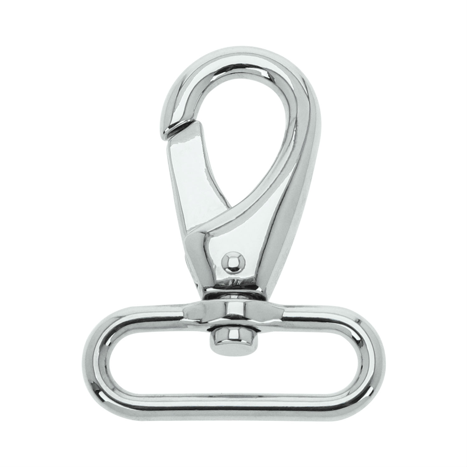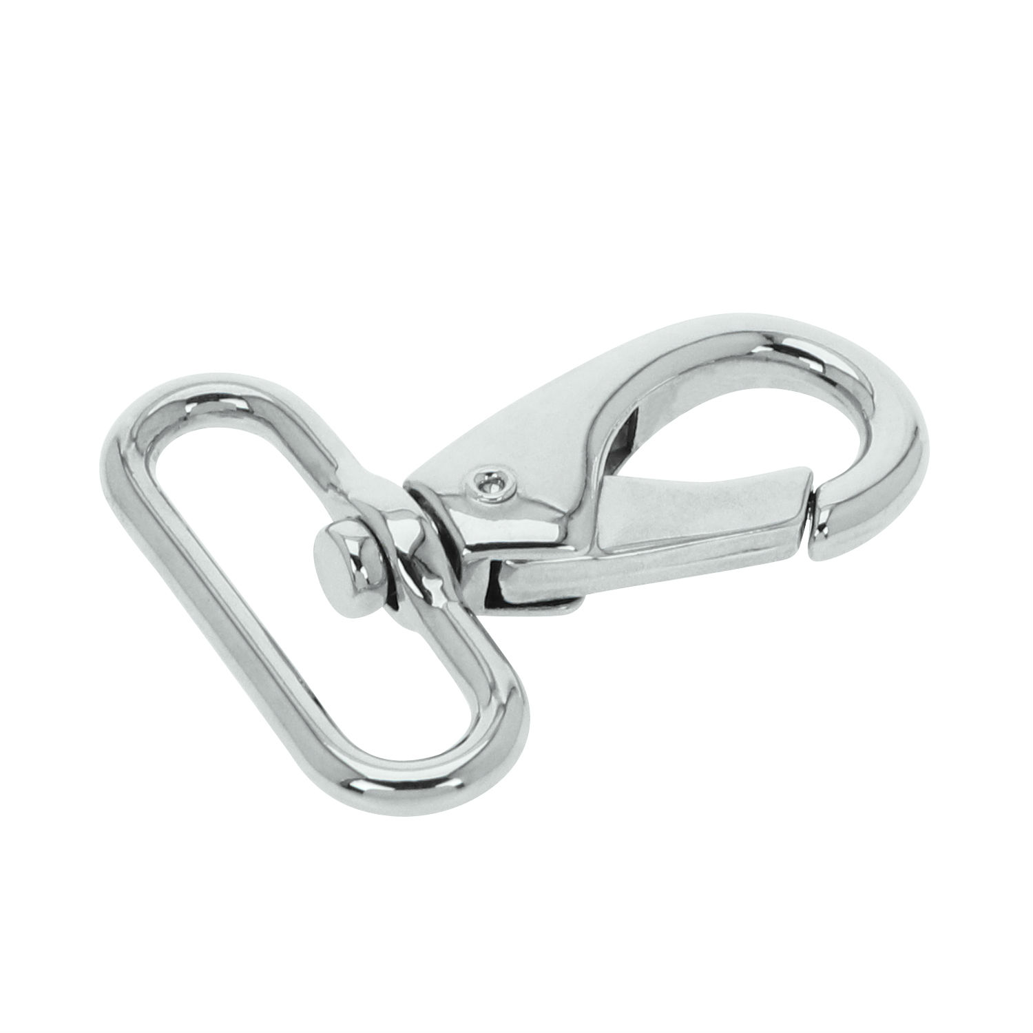 This belt hook is made of zinc alloy and has a shiny silver toned exterior. It is equipped with a loop in a rounded rectangular shape and has a swivel snap hook for attachment. The zinc alloy belt hook flaunts a sturdy construction and is ideal for webbing attachment use.