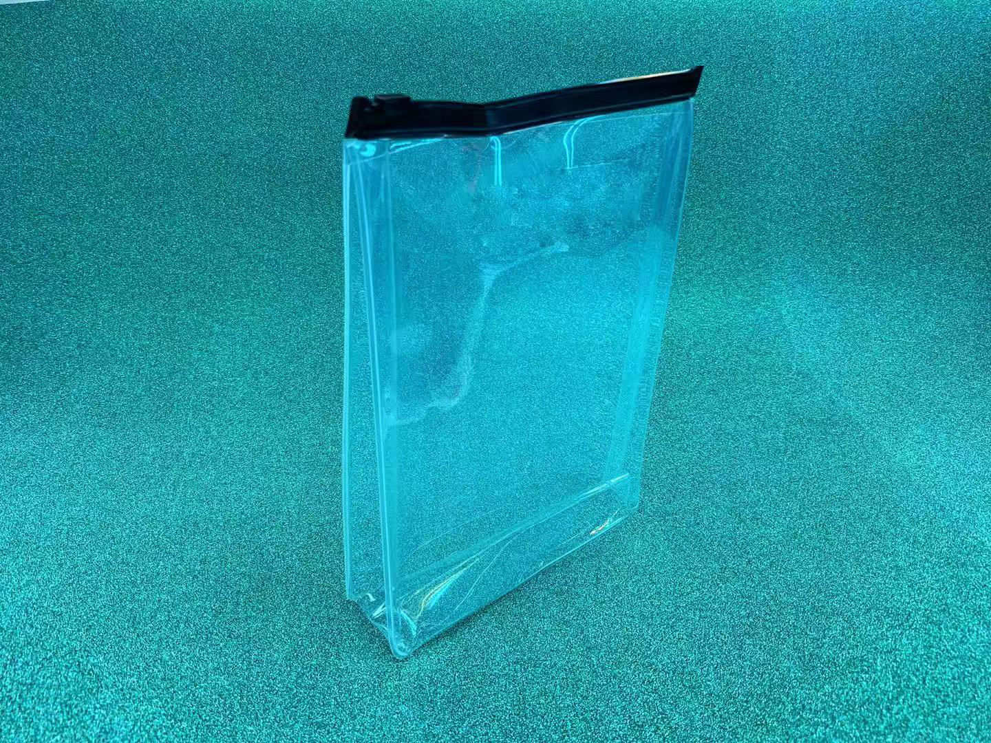 This PVC/EVA bag has a clear colored rectangular body with side gusset structure and offers lots of space for storage. It allows you to easily see where the contents are and has a sliding zipper on top for easy access of contents. The zippered bag is excellent for traveling use and can keep you organized on the go.