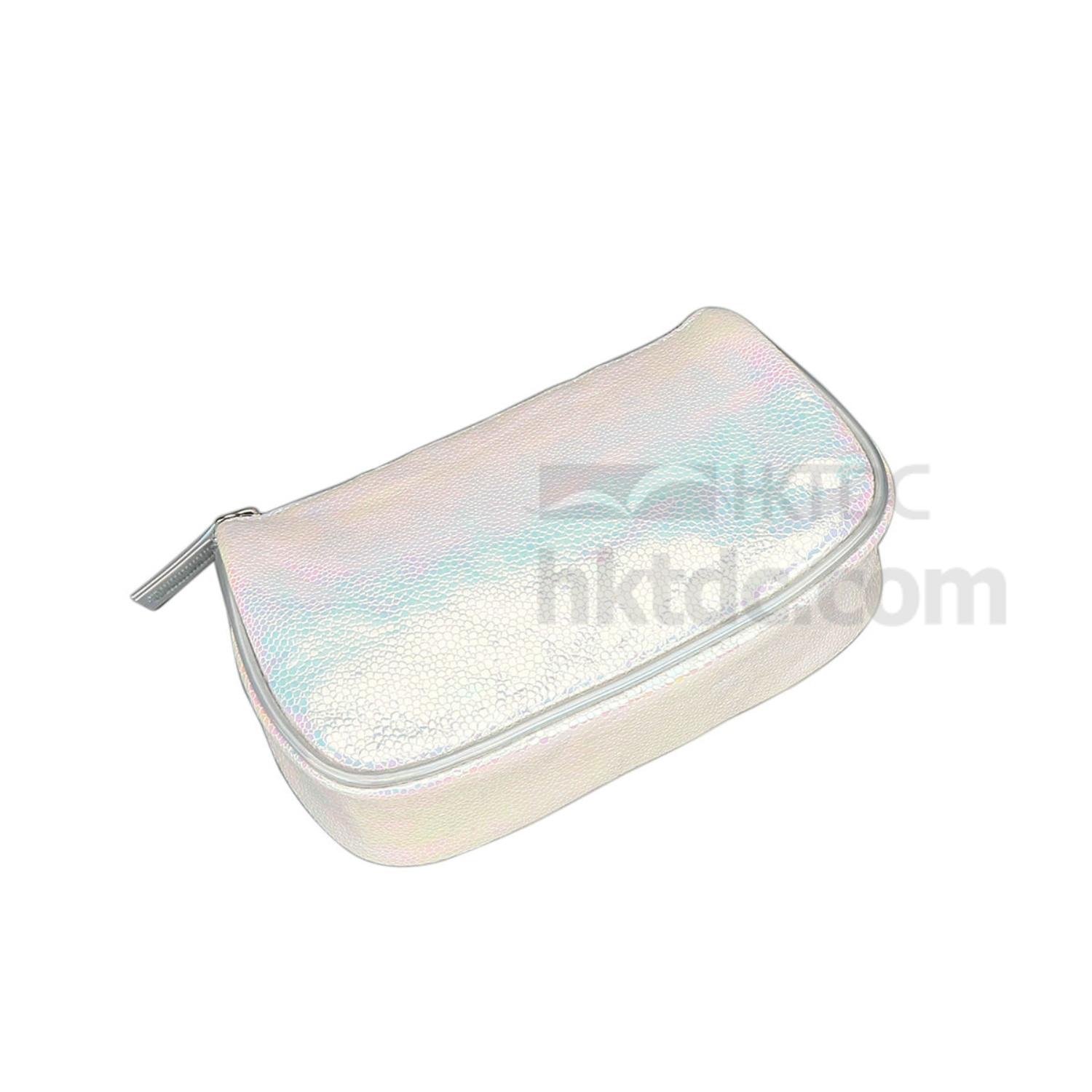 This classic cosmetic bag is made of grainy PU leather, boasting a fancy look with a shiny, iridescent finish in the shades of pink and white.  With a large-capacity main compartment, keeps your cosmetics with you wherever you go with a secure zipper closure. Coming with a polyester lining and piping details, this rugged, structured bag can stand for daily wear and tear.