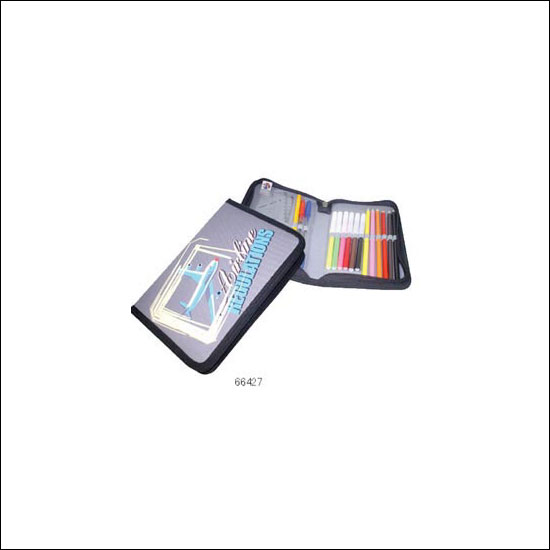 Organize your stationery in this zippered pencil case. It features a rectangular profile in grey with a graphic of an airplane, secured with a black sturdy padded border. The interior includes a row of elastic pencil slots on 1 panel, and another panel with different sized elastic slots for pencils, erasers, rulers and more.