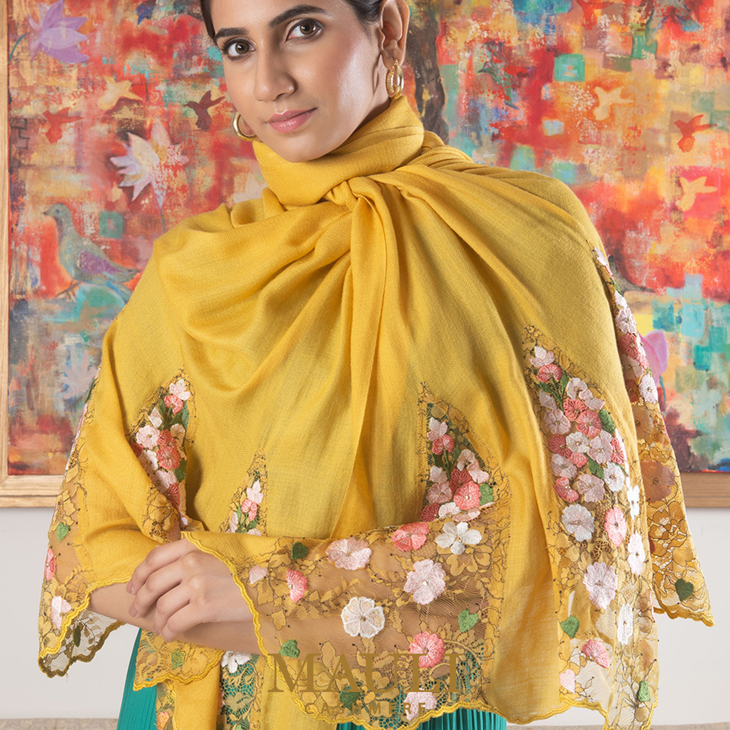A delicate trail of exquisite golden roses made with precise zari and thread work, this Mauli is a reminder of love wrapped in subtle glamour. Wrap it around or simply let it flow from your shoulder for sophistication.