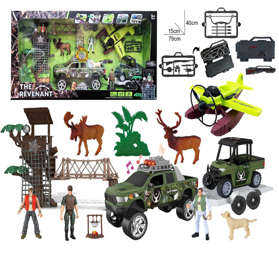 Hunting play set including hunter,weapon,animal,vehicle and so on. Some part with light and music,including AG13 battery
