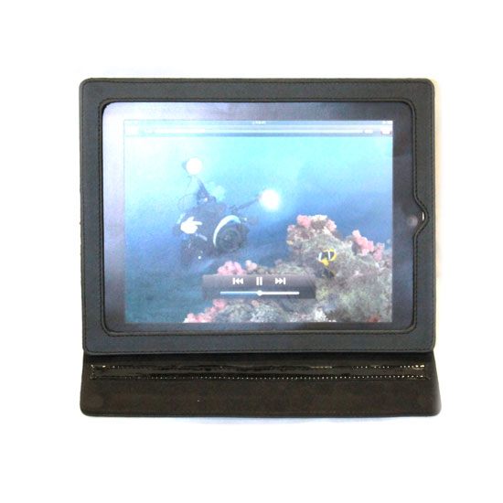 The picture displays a multifunction iPad case which can be used not only as a cover but also a stand. The case is robustly made of high-quality leather for extra durability. It can effectively protect your iPad from scratch, stain, and dust.