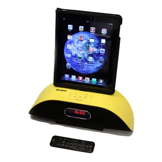 This stylish iPad dock features a bright, bold appearance in yellow. It features charging, music playing and radio functions. It is also designed with alarm and remote control operation for extra convenience.