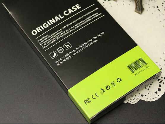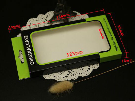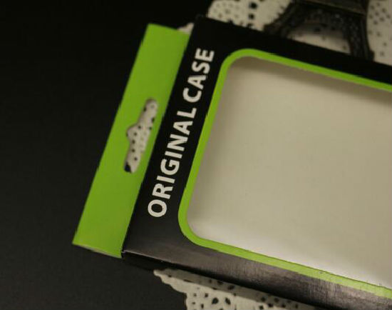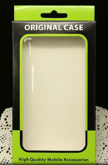 This packing box for phone covers sees a standard quadrangular profile with well-defined edges to suggest a minimalist look of contrasting hue. It further tours a slim header with a centered hanging hole for convenient display in stores.