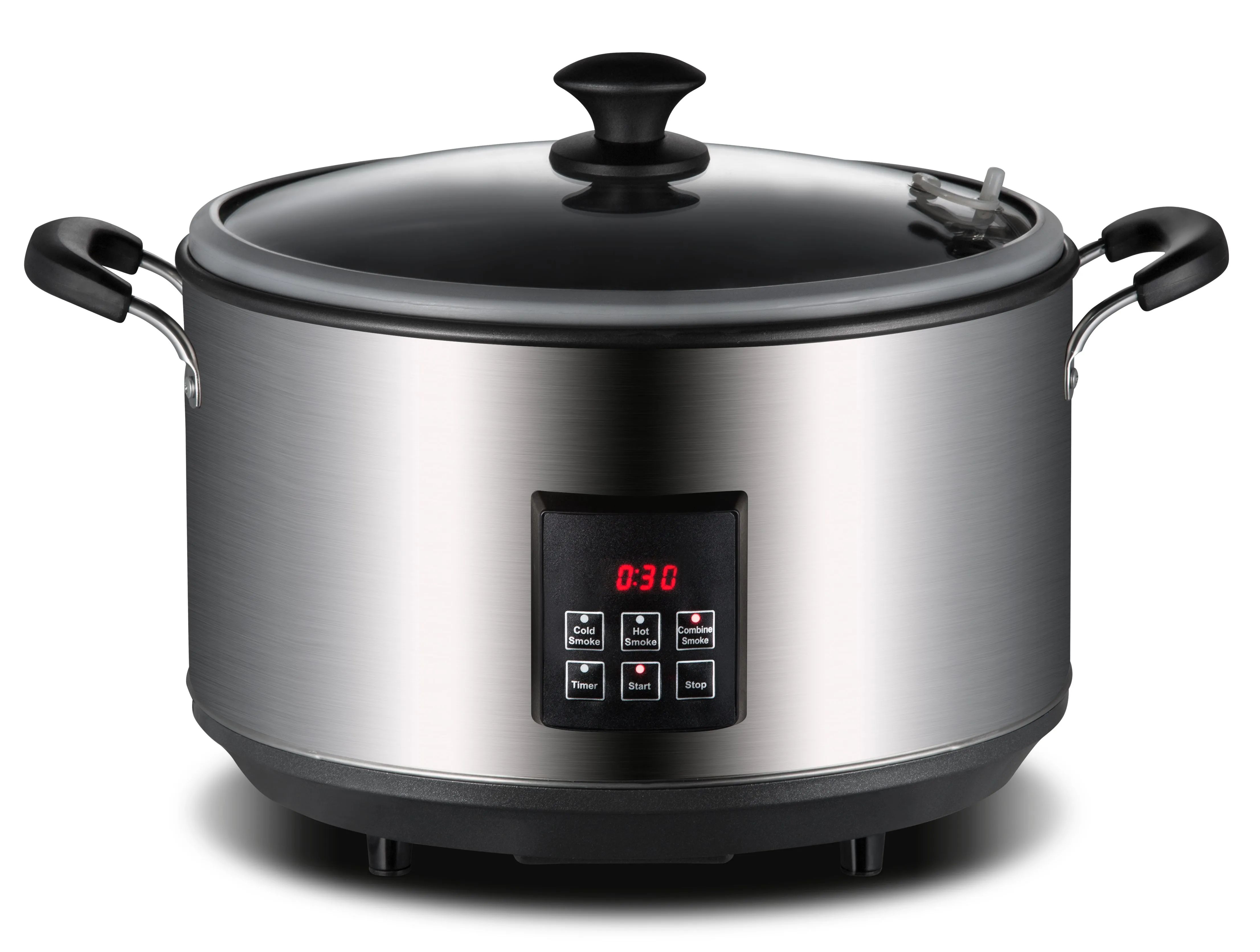 Functions include Hot smoke, cold smoke, combined smoke ; warm  function;  Stainless steel wrapper Glass lid with silico edge; lid with detachable silicon stopper With accessories of 3 layers of smoke racks, stainless steel charring cup and ss charring cup lid