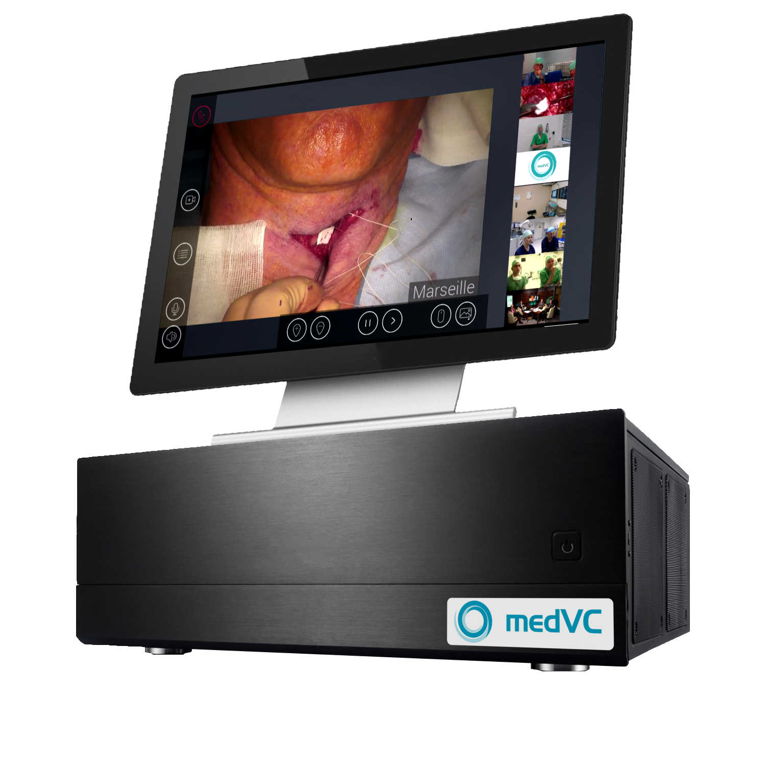 medVC is a remote collaboration tool for medical professionals allowing real-time audio-video communication and the usage of specialised medical services. It is designed to be installed in operating rooms, conference rooms and doctors offices and makes it possible to send multiple High Definition (HD) video streams coming from cameras, microscopes, endoscopes and other medical equipment. The doctors have the possibility to pause video streams, mark areas and draw on the picture, take snapshots, collaboratively work on DICOM images, record a session or even broadcast it live over the Internet. Furthermore, medVC is capable of transmitting stereoscopic (3D) video coming from cutting edge medical devices, like surgical robots or 3D endoscopes. All these features make medVC a superb remote collaboration and education tool for medicine.