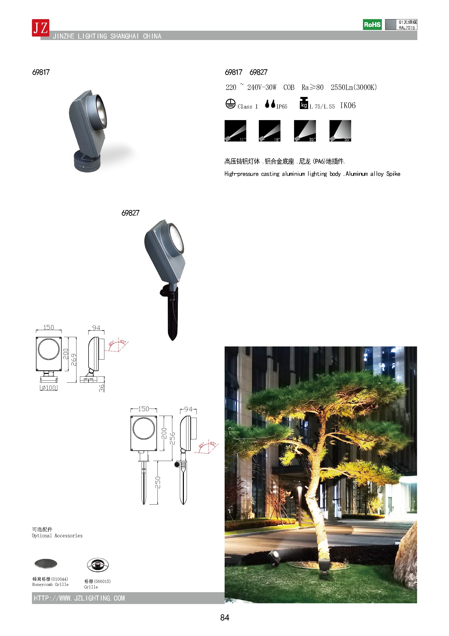 flood light: High-pressure casting aluminium lighting body.Aluminium alloy spike ,IP65 Ra≥90,Optional Accessories Honeycomb Grille and others