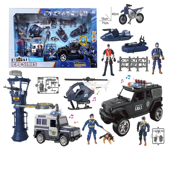 Police play set including chariot, warcraft, soldier,weapon,tank,warship and so on. Some part with light and music,including AG13 battery