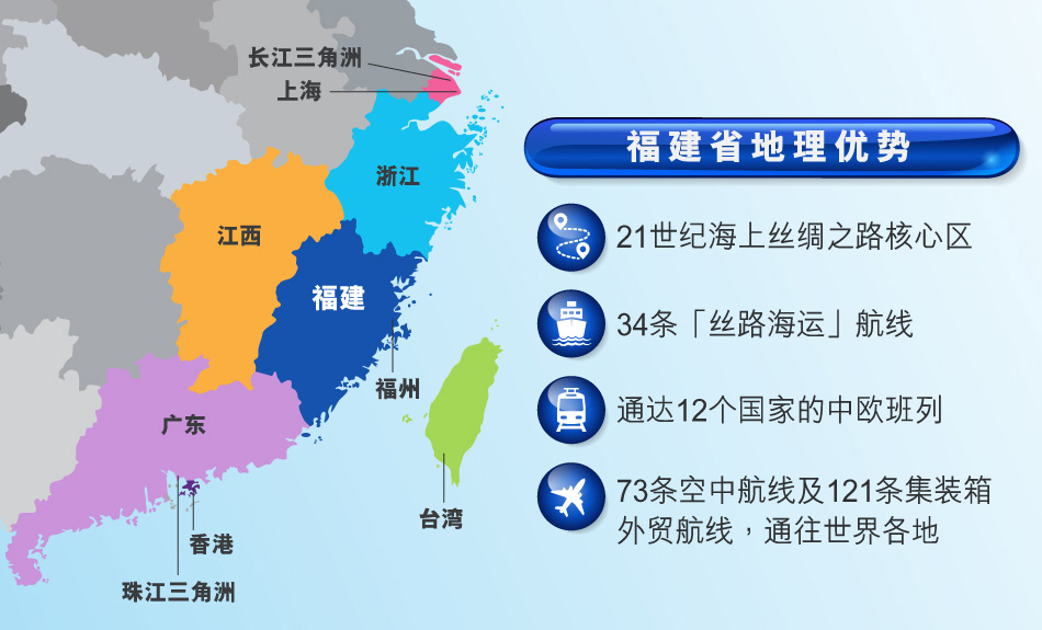 福建是21世纪海上丝绸之路核心区,34条「丝路海运」航线,通达12个国家的中欧班列,在这里交汇。还有连接五大洲主要城市和港口的73条空中航线、121条集装箱外贸航线,让福建既是全世界的目的地,也是走向世界的中转站。此外,福建还具有国家生态文明试验区、中国(福建)自由贸易试验区、平潭综合实验区、福州新区、福厦泉国家自主创新示范区等「多区叠加」优势,战略地位更加突出,政策优势更加明显。