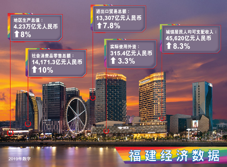 改革开放40年,福建经济总量从60多亿上升到42,300亿元(人民币,下同),福建跻身中国经济综合竞争力优势省份行列,是当前中国经济最具成长性和竞争力的区域之一。2019年,福建生产总值42,300亿元,社会消费品零售总额14,171.3亿元,增长10%,进出口贸易总额13,306.7亿元,增长7.8%,实际利用外资315.4亿元,增长3.3%。城镇居民人均可支配收入45,620元,增长8.3%;农村居民人均可支配收入19,568元,增长9.8%。