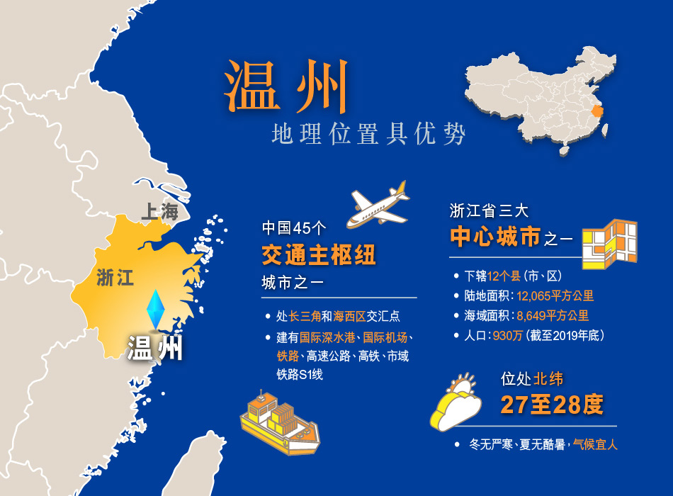 浙江省温洲市地理环境优越,交通网络发达,以对外开放为基、高新产业为本,以专业人才及强力平台为支撑,藉商贸通行天下。