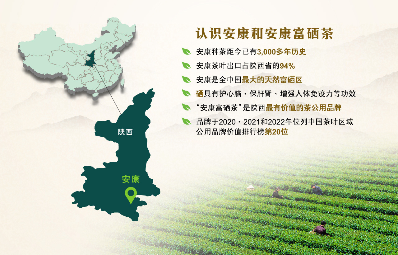 安康位于陕西省东南部,地处南北生态气候过渡带,秦岭巴山横亘南北、千里汉江流经西东,是中国南方的北方、北方的江南。安康是南水北调中线工程水源涵养区,秦巴山水好,茶因水而生津、水因茶而灵秀;安康是全国最大的天然富硒区,被誉为“世界硒源、中国硒谷”,被专家一致评价为“优质、环保、安全”的富硒区域。安康坐拥独特的生态地理优势,为茶叶提供了理想的生长环境,是地球上同纬度最适合茶树生长的地方,是中国最北方的生态茶区和全国富硒茶最好的产区。
