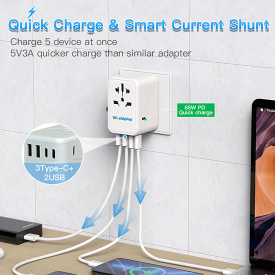 3.With 2 USB and 3 Type C ports, can charge 6 devices at the same time.