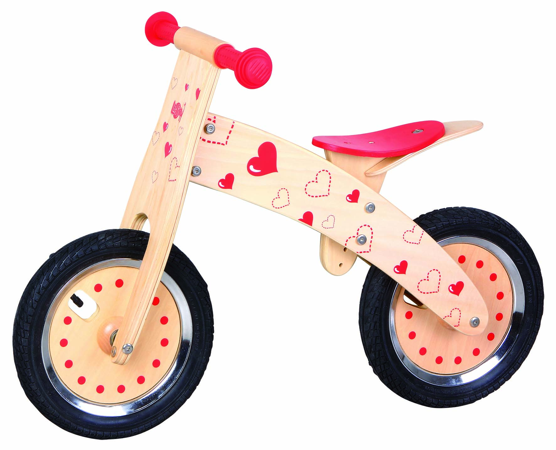 This balancing bike is decorated with hearts. A fun way to develop balance and motor movement. Great for indoor and outdoor play. Take care on wet surfaces and have adult supervision. Adjustable seat height, easy grip handles.