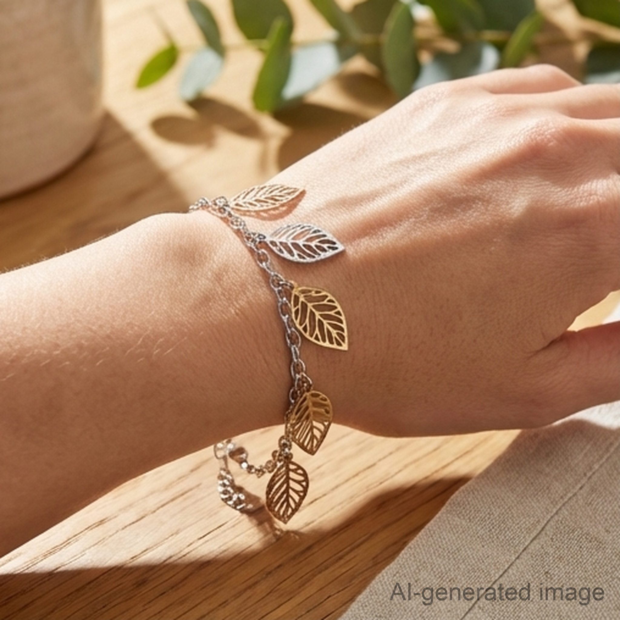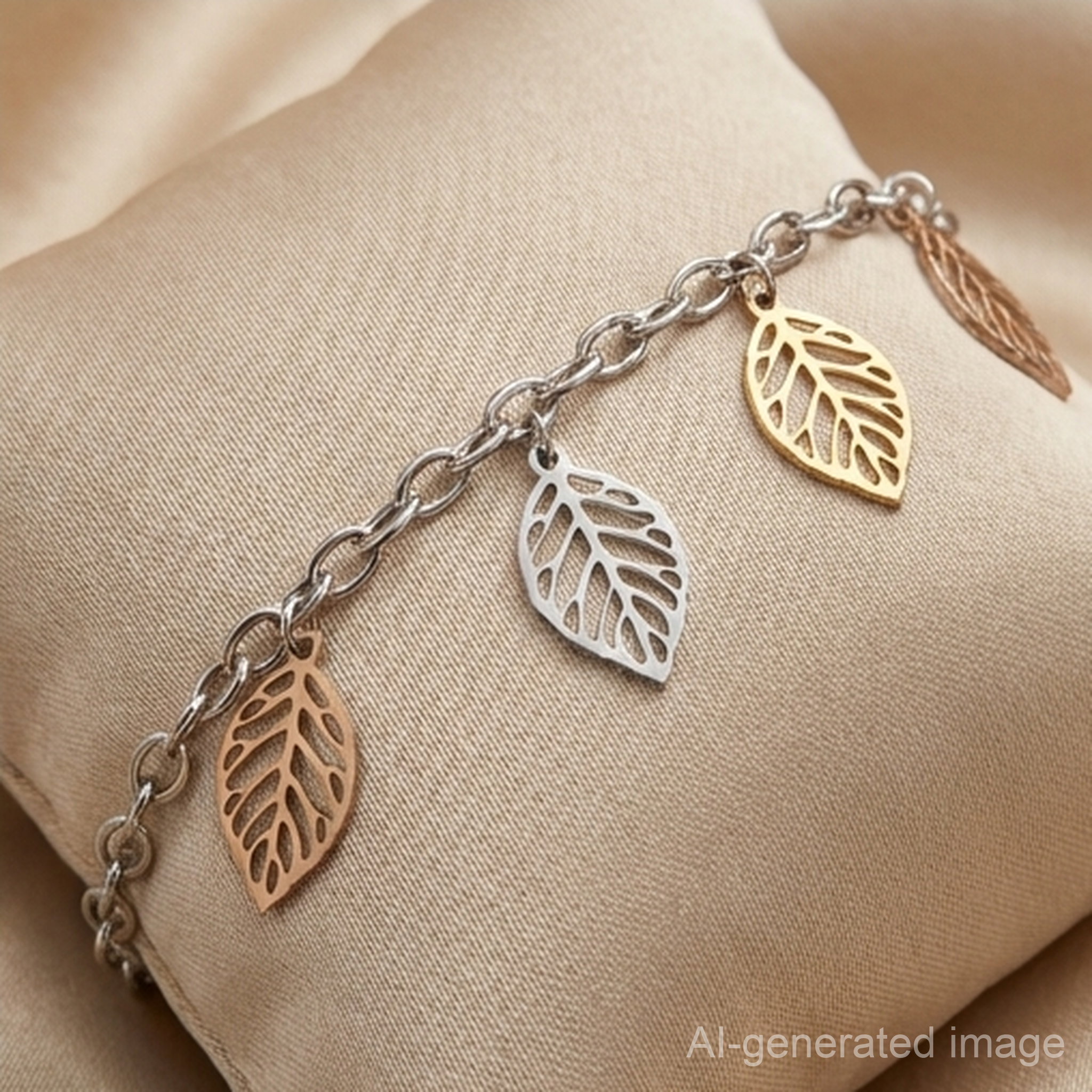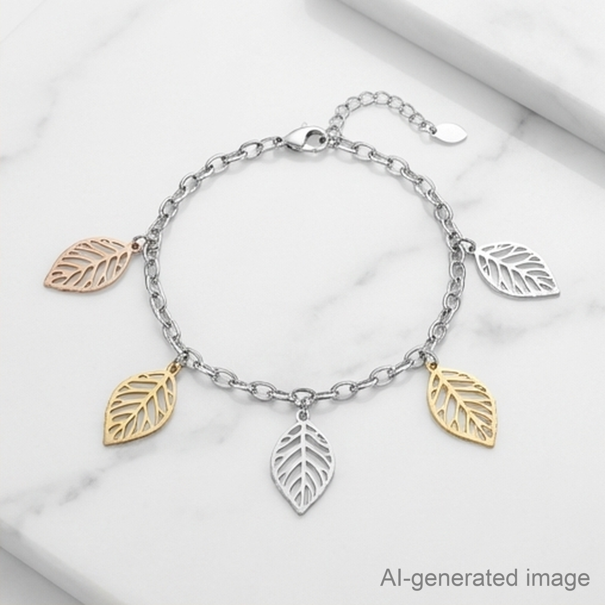 ✨ Features five leaf-shaped charms in mixed metallic tones – silver, gold, and rose gold – each with intricate vein detailing.