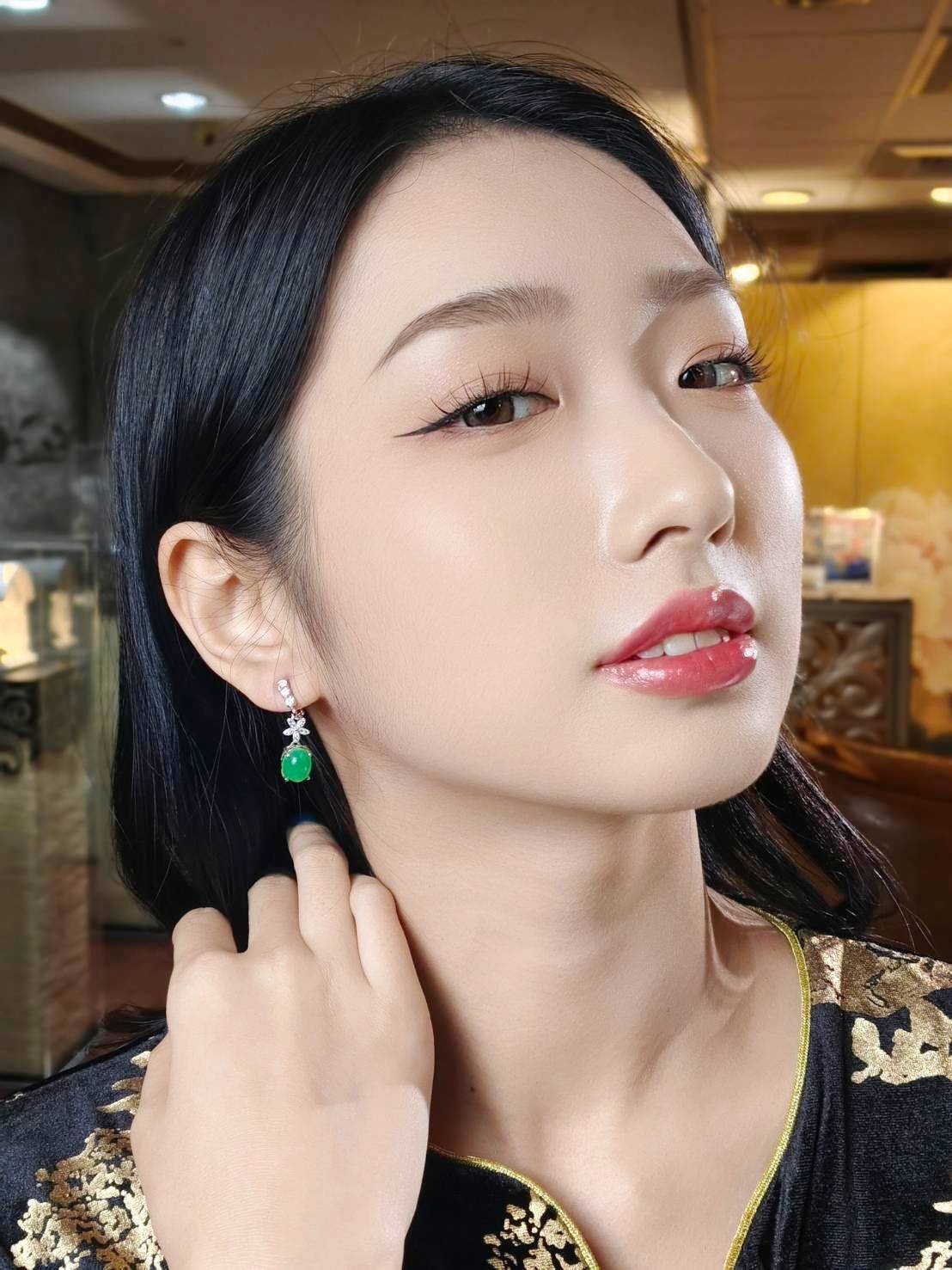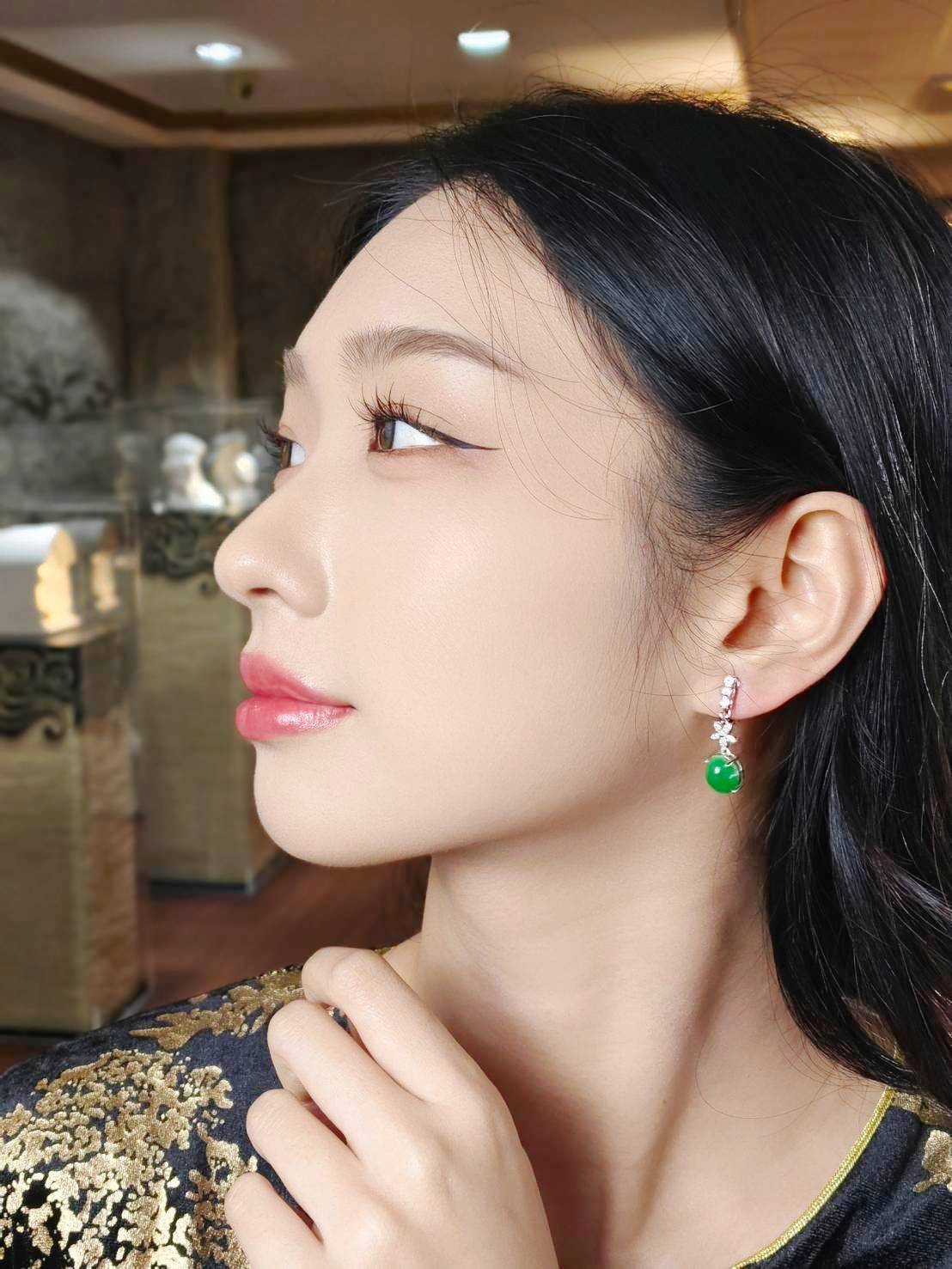 這對翡翠耳環以鮮豔細緻的翠綠蛋面為主角,色澤亮麗通透,在光線下散發柔和光彩。耳環上方鑲嵌璀璨小鑽,延伸出精巧的花朵造型,增添浪漫與優雅氣息。整體設計輕盈垂墜,佩戴時隨著微微擺動更顯靈動迷人,展現細膩工藝與高雅氣質。