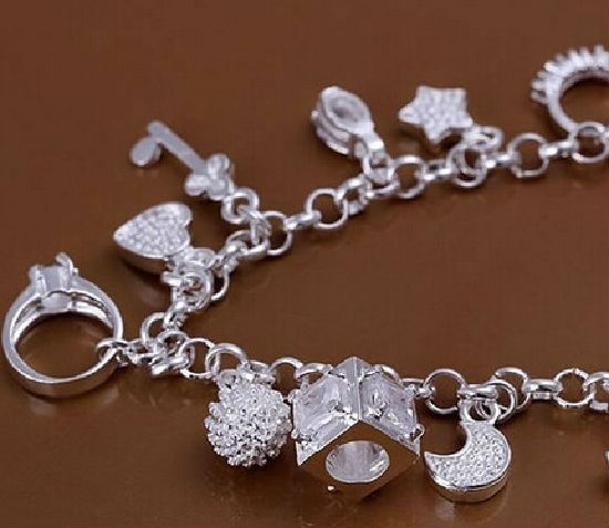 Displayed is a stylish bracelet which is adorned with several interesting charms. The metal bracelet is made of many silvery loops to give a chic touch. You can select your favorite charms from assorted designs to create your unique style.