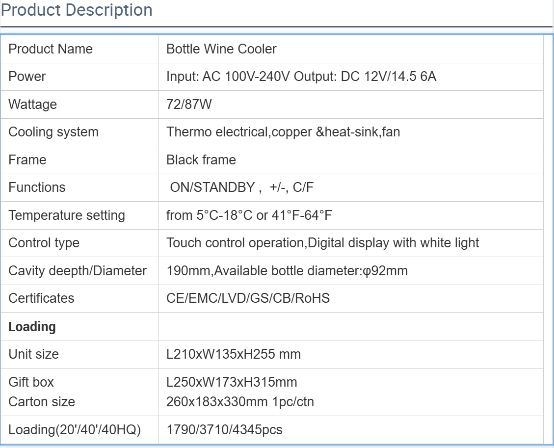 GS/CE/CB/SAA Wine Chiller for one bottle