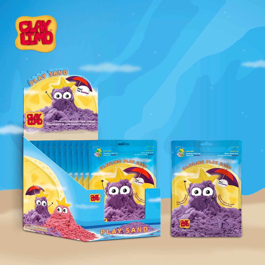 CLAYLIMO PLAY SAND 100g/3.53oz in a resealable foil bag, 12pcs packed in a counter top PDQ. Play Sand is made with natural sand! Never dries out! Squeezable, mouldable and buildable, super kinetic flow, superior quality and value, formaldehyde free, parabens free