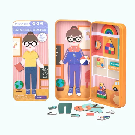 The Teacher set includes two scenes and more than 30 magnetic puzzle pieces, where they can dress up their character and invent their own stories. Using touch and feel, kids can play with both hands to stimulate their left and right brain development.