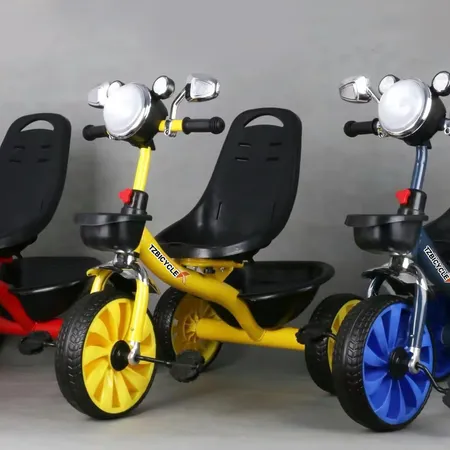 0.9mm thickened steel frame similar moto model, 0.8mm steel fork, safe and environmentally friendly handlebars, beautiful plastic wheel with EVA tire , more soft enlarged seats, one click installation, children tricycle with light and music, enlarged rear basket, matte baking varnish, anti roll setting