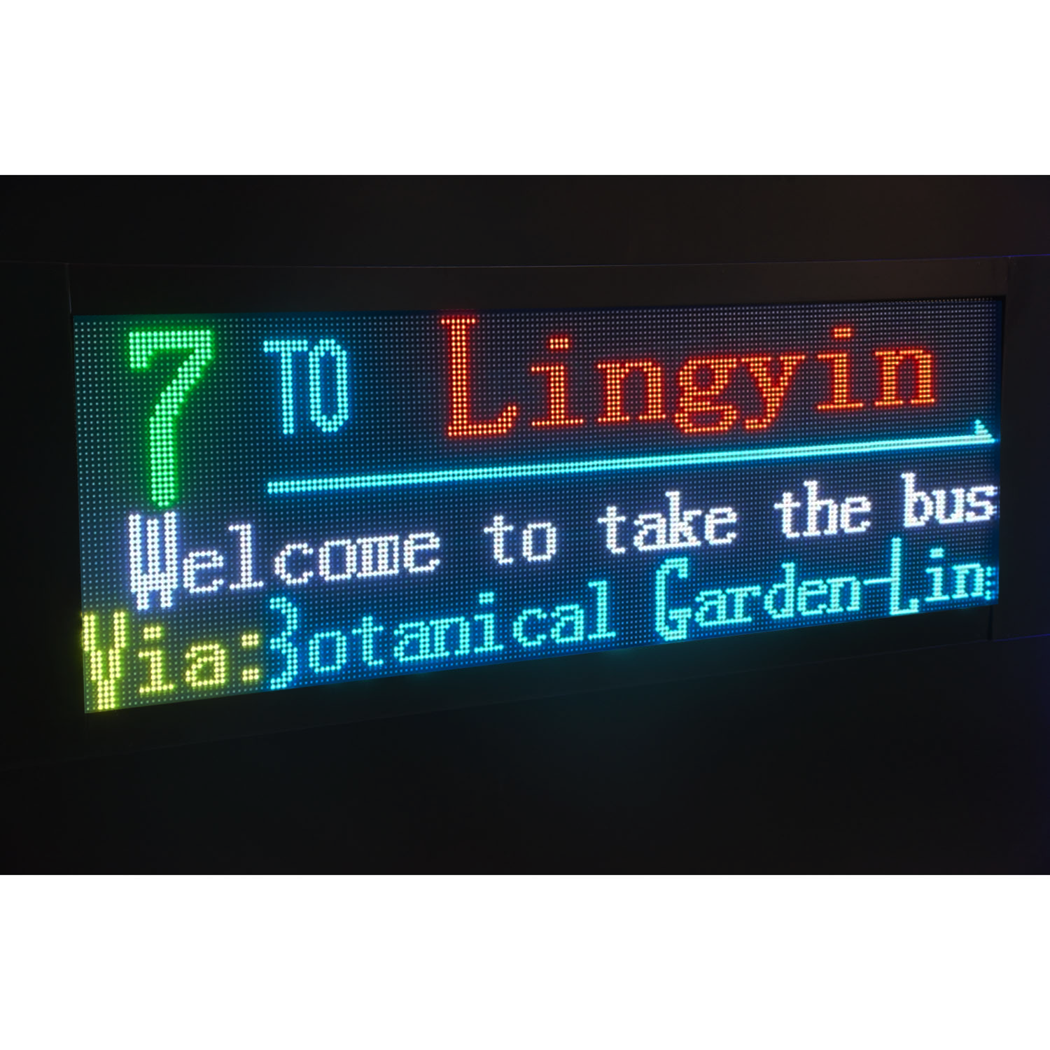 Bus led display screens support multi-language display, including English, Chinese, Arabic, etc. The content can be static and scrolling.and images, text, etc. can be displayed. The color can be configured arbitrarily, and the brightness can be automatically adjusted according to the external brightness, It also supports remote operation and mainte-nance upgrades.