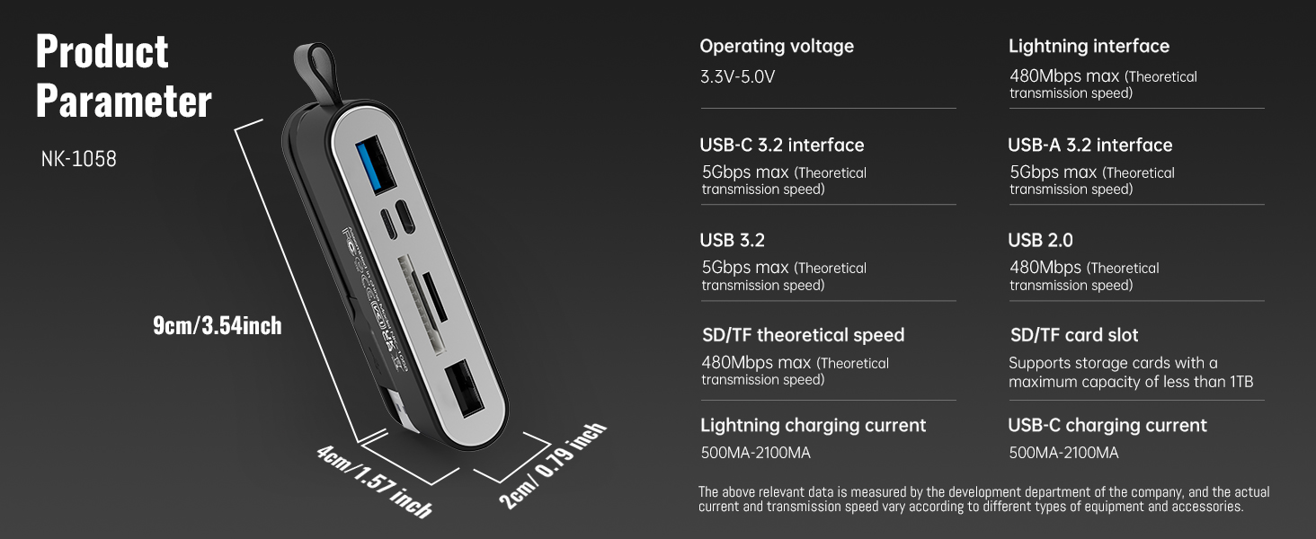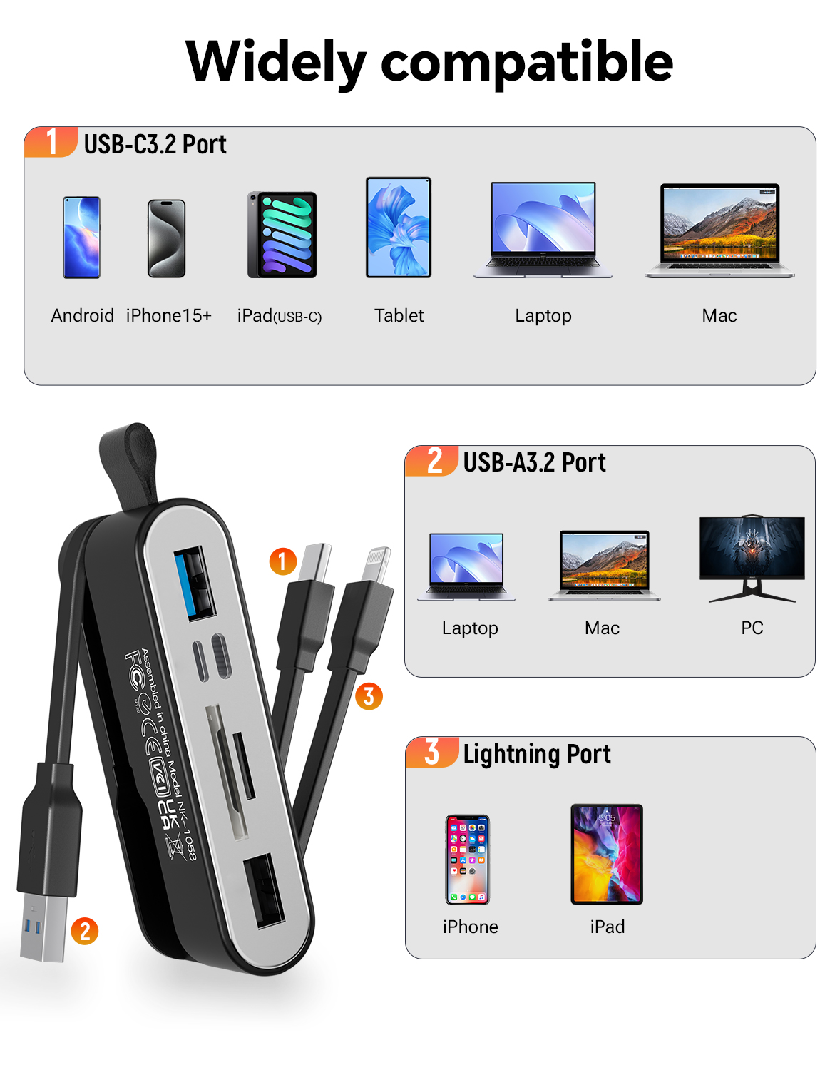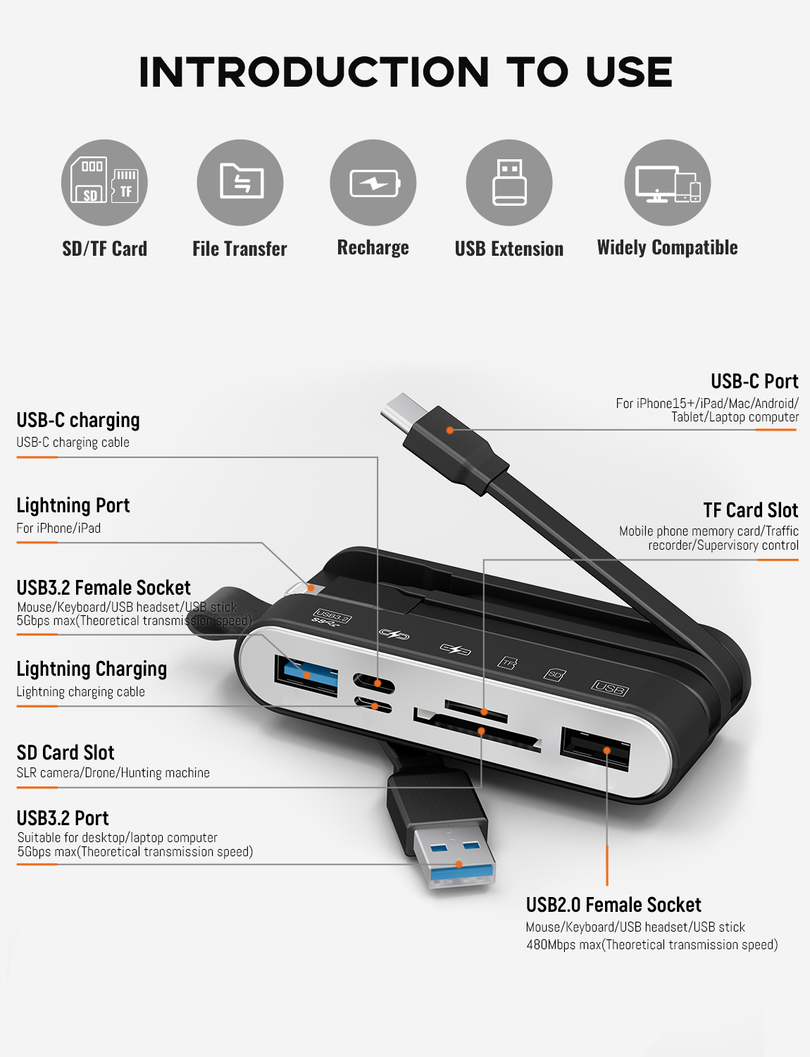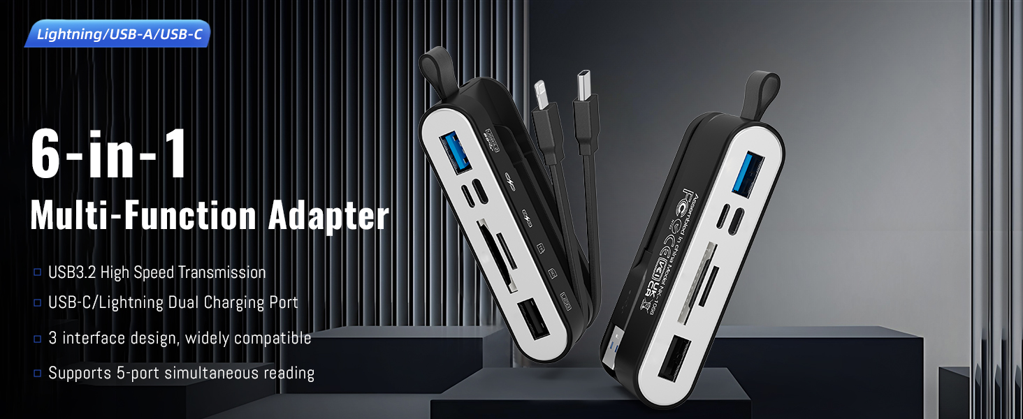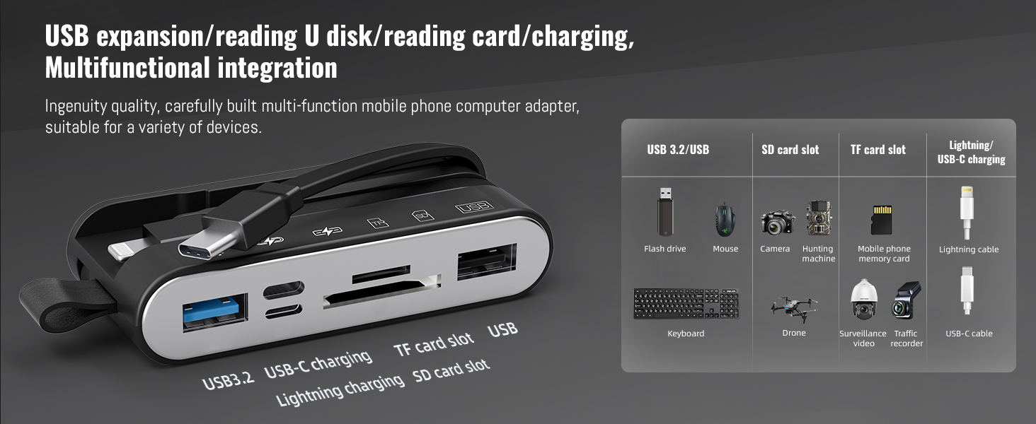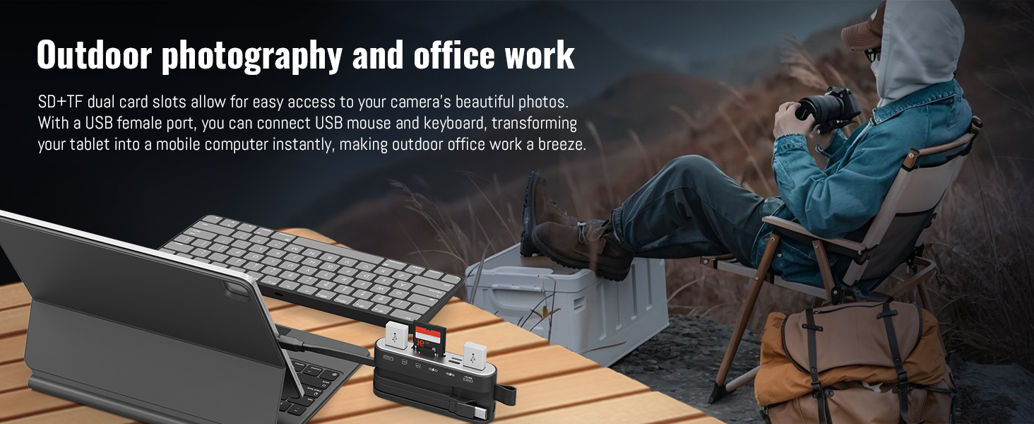 It supports three interfaces: Lightning, USB-A, and USB-C, and is widely compatible with devices such as smartphones, computers, and tablets. Equipped with TF and SD dual card slots, it can simultaneously read two storage cards, easily obtaining photos, videos, and other materials from the camera; The USB socket supports expanding the mouse and keyboard, allowing the tablet to instantly transform into a mobile office device, and can also handle outdoor work with ease.