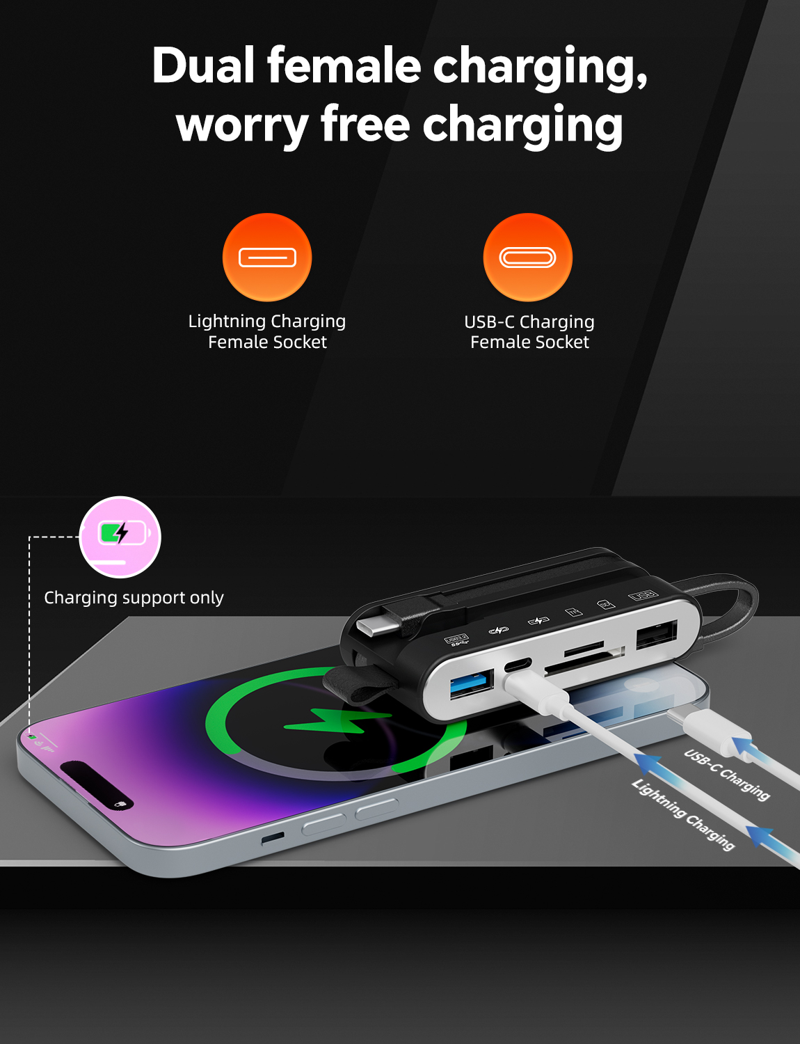 Dual port charging ensures battery life: Designed with USB-C and Lightning dual charging ports, it can charge phones and tablets while transmitting data, meeting the needs of continuous use.