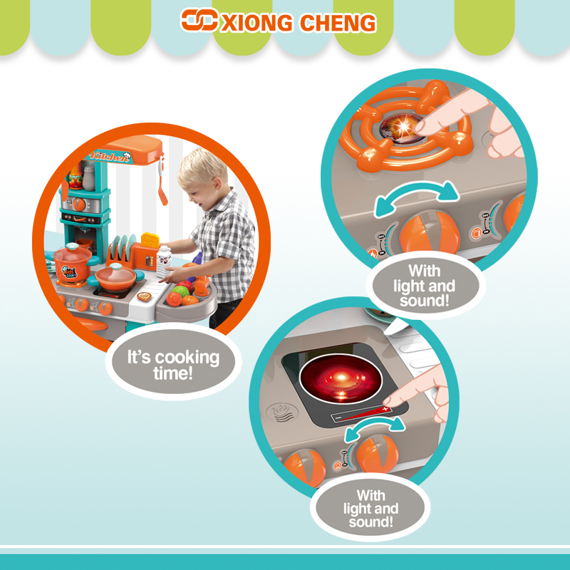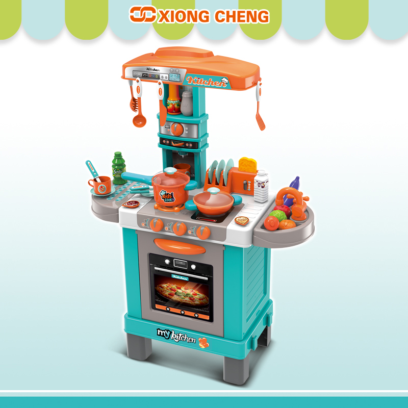 To enhance the play experience, the set also comes with a variety of play food items. These include plastic fruits, vegetables, meats, and baked goods, all painted with vivid colors to look appetizing. There are also condiment bottles, plates, cups, and cutlery, allowing your child to set the table and serve a complete meal.