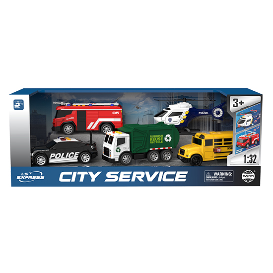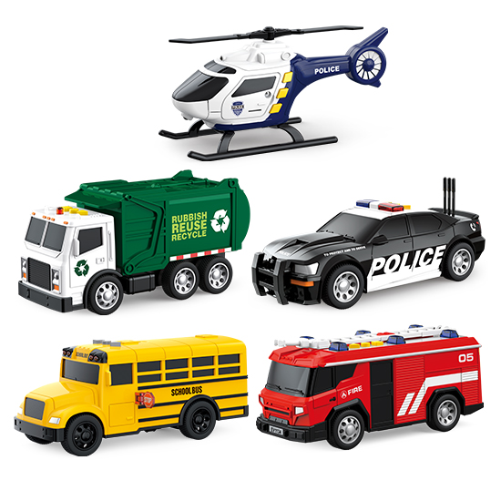 1:32 City set.Sanitation truck,police helicopter and vehicle,school bus,fire truck.Friction driving with light and sound function.