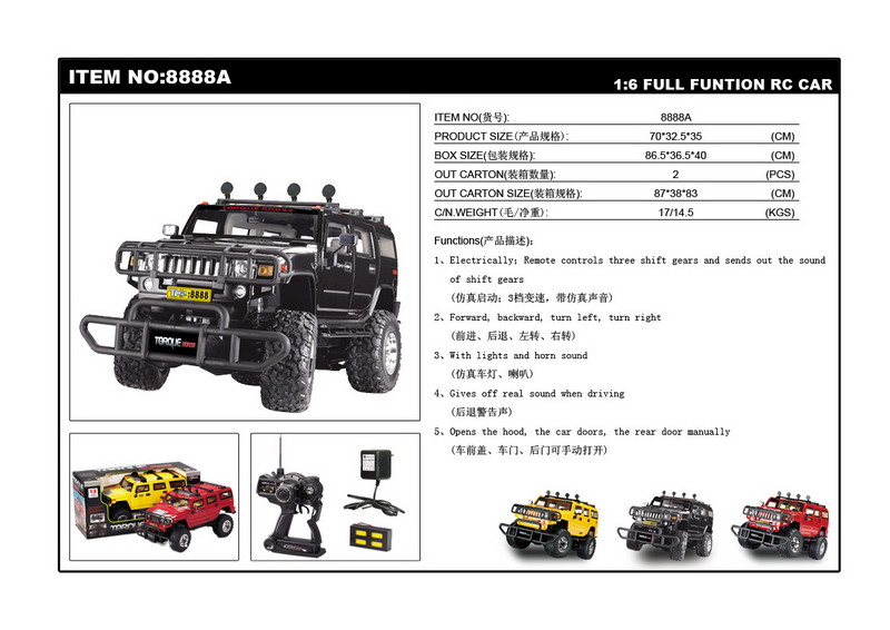This is a full black handsome hummer car. It is the dream car for many men and boys. The hummer car has a very strong and powerful appearance, the black colour makes it looks especially cool. The accessories of the car is delicately manufactured, which make the car more detailed and real.