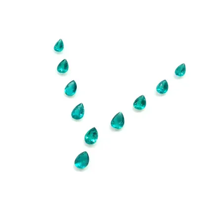 These 10 Colombian emeralds come in a set. Each pear-cut gem exhibits superior fire and scintillation. You will surely be tempted by the turquoise sparkles of these precious stones.