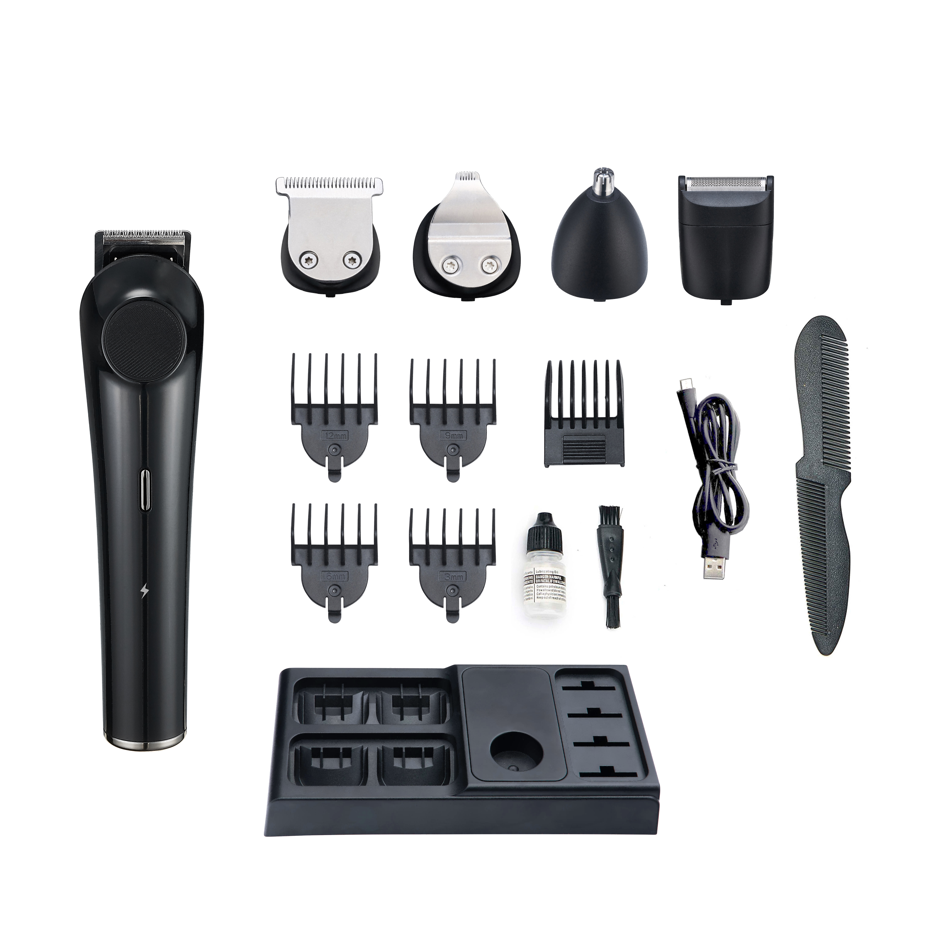 6 comb attachments:4 for hair clipper and beard trimmer (3,6,9,12mm), 1 for body trimmer(2.8,5.8,9.8mm), precision trimmer(4-5.5mm, 4 level)
