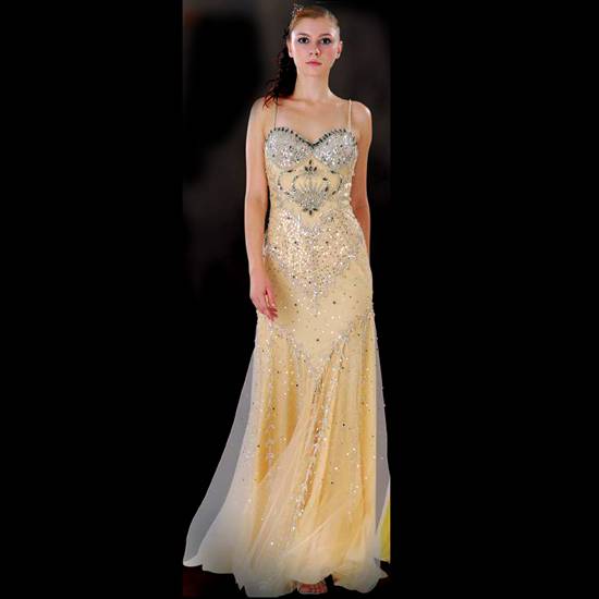 The evening dress is studded with silver and emerald beads and sequins. The dress is glittery yellow and can be made in a tone which suits your taste. The dress is made of 100% polyester.