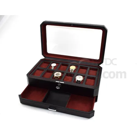 12 Slots PU Leather Wooden Watch Box with Drawer