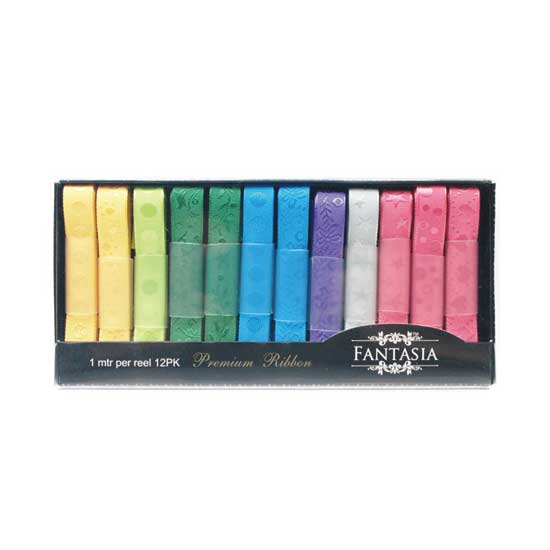 This luxurious ribbon set is comprised of 12 pieces of 1m ribbons in rainbow colors. Each ribbon in a solid color features intricate patterns for attractiveness. This premium ribbon set is ideal for gift packaging use.