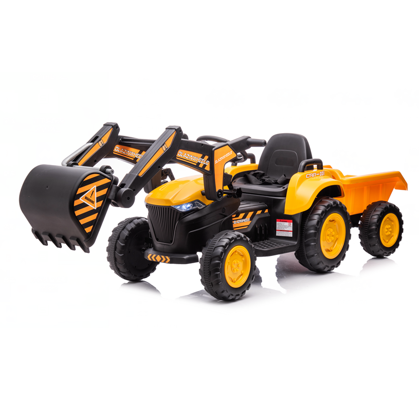 One button start, engine sound when switching on, headlights, forward and reverse, multifunctional music player, power display, volume adjustment, USB socket, MP3 socket, rear trailer can be manually flipped.front bucket is workable,left handle bar to lift the arms and right handle bar will control the bucket up or turn over ,the lift arms are make of hard ABS plastic and metal.
