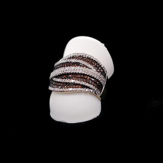 This is a 14K gold finger ring that shimmers with a high-gloss finish. The allover dazzling white and brown diamonds add a touch of style to the whole piece. This finger ring is an ideal addition to complete your jewelry box.