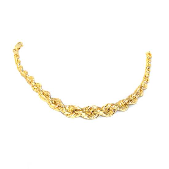 This is a 14k yellow gold bracelet featuring a graduated rope chain. The simple style highlights the glorious and shimmering beauty of the gold finish, which makes the bracelet an enchanting and attractive piece to every lady and woman.