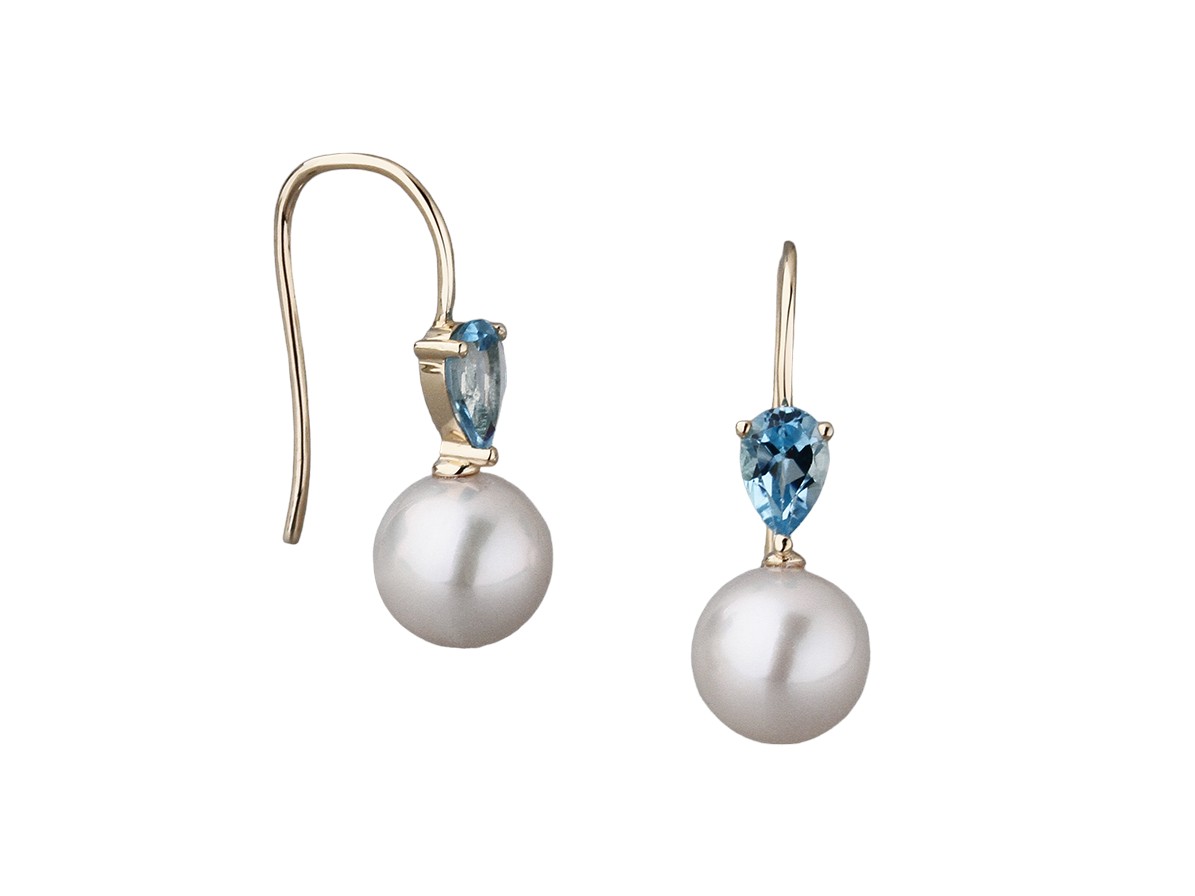 14K YELLOW GOLD EARRINGS WITH 8-8.5MM ROUND SHAPE FRESHWATER PEARL AND SWISS BLUE TOPAZ