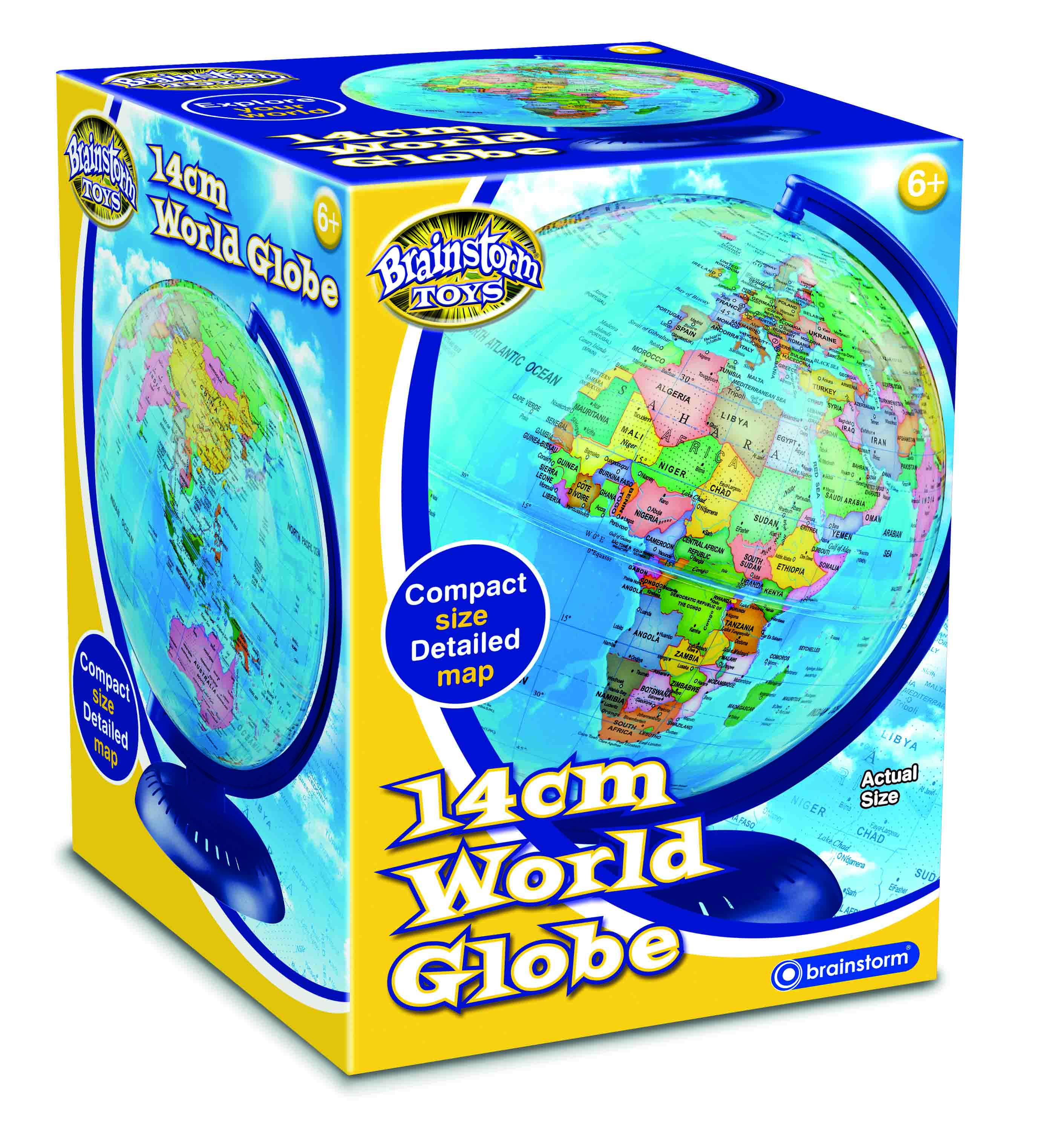 Explore your world with this high quality but compact 14cm World Globe. This detailed globe shows political boundaries, natural features such as lakes, rivers and deserts plus capitals and major cities. The scale of the globe is 1:90,000,000. With a sturdy base, the globe easily rotates to view different areas of the world and encourages inquisitive children to explore the world around them. Ideal for home, school or office this perfect desktop globe is a great learning tool for geographers but also lovely feature for any bedroom, living room or study.