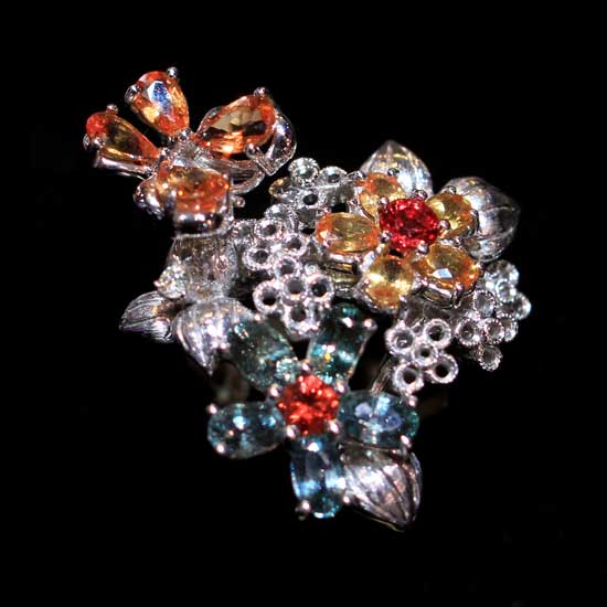 This white gold sapphire ring presents a charming burst of colors. Ornate detail of flowers and leaves are added. This beautiful gemstone ring is a very tempting piece of fine jewelry.