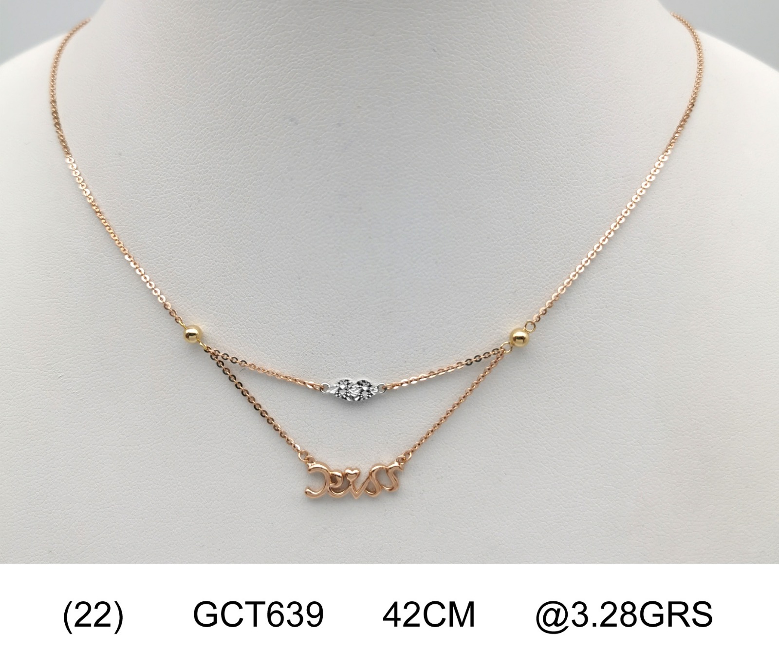 A pink color chain designed in two layers connecting by 2 pieces of shining balls in yellow color. The top layer centering with 2 white color diamond cut plates while the lower layer centering with the word "kiss".