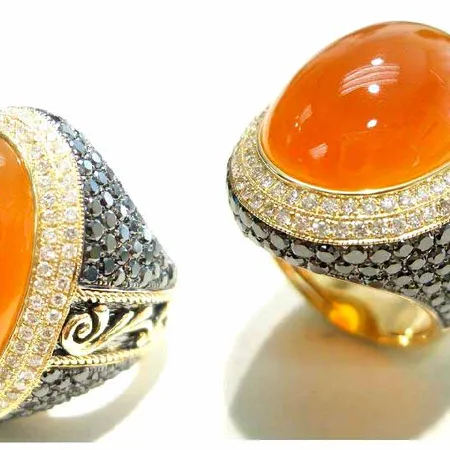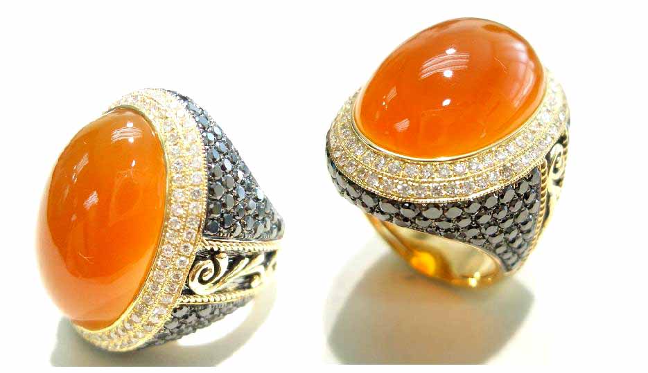 • This ring features a cabochon coral gemstone set with pave white and black diamonds.
