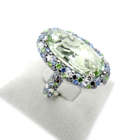 This is a ring made in an 18K white gold setting. The oval-cut green amethyst, as the main stone, is adorned with the surrounding diamonds and blue and green sapphires. It is perfect for complimenting your elegant outfit.